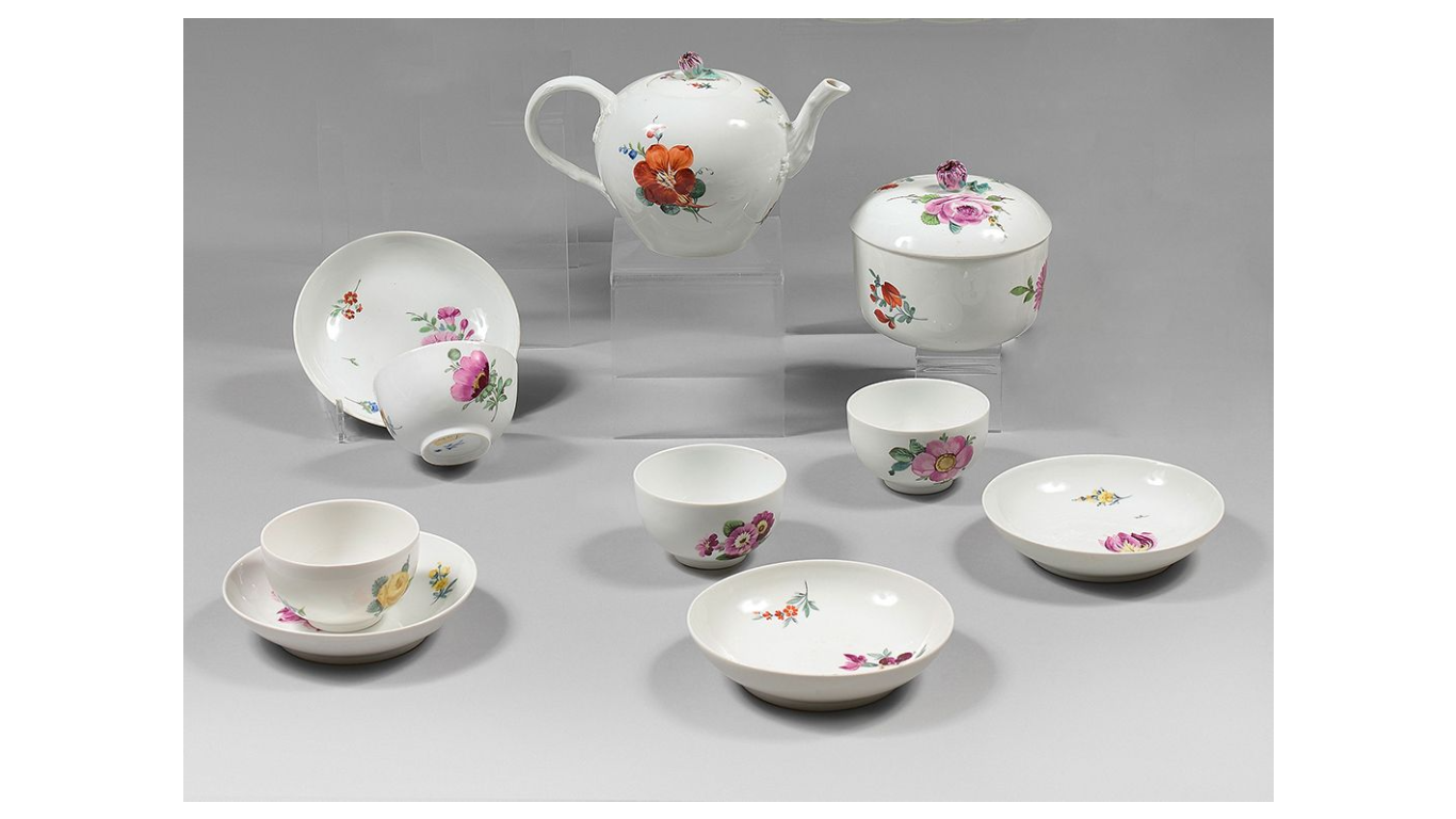 Miśnia , Marcolini , koniec XVIII w , w skład wchodzą ; cukiernica , czajniczek , cztery filiżanki z podstawkami