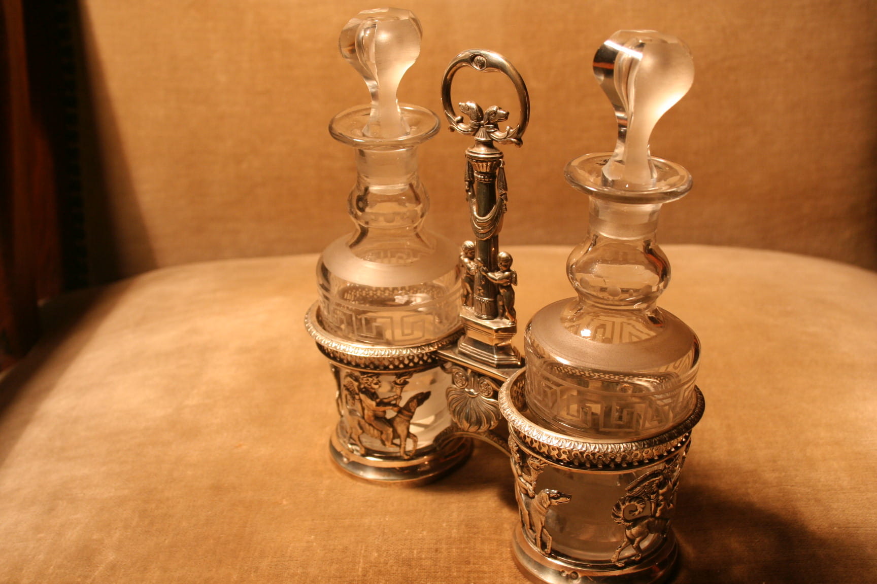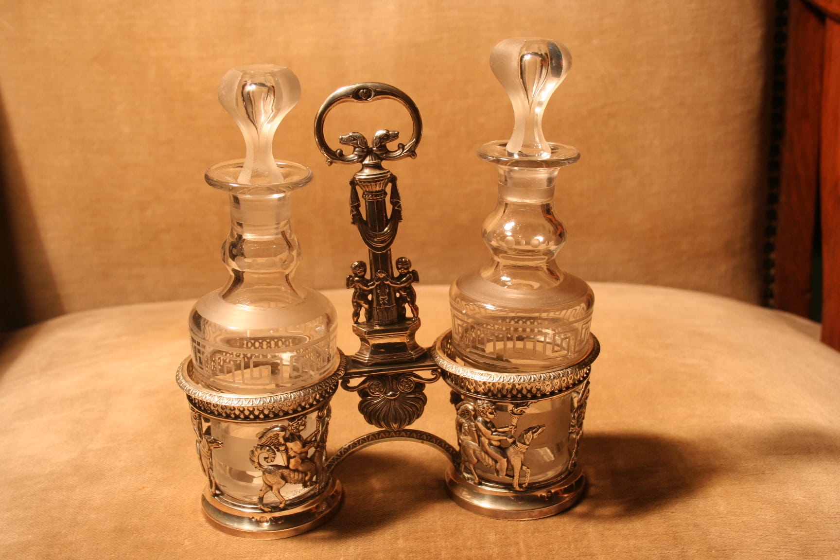 Elegancki francuski srebrny kabaret stołowy do oliwy i octu w stylu Empire, pochodzący z końca XIX wieku. Konstrukcja wykonana ze srebra próby 800, dekorowana figuralnymi przedstawieniami putt jadących na psach oraz motywem delfinów w uchwycie. W komplecie dwie szklane karafki z korkami zdobione ornamentem meandrowym. Przedmiot o bardzo dekoracyjnej formie, typowy dla luksusowych sreber stołowych francuskiego rzemiosła artystycznego. Francja, ok. 1870–1900.