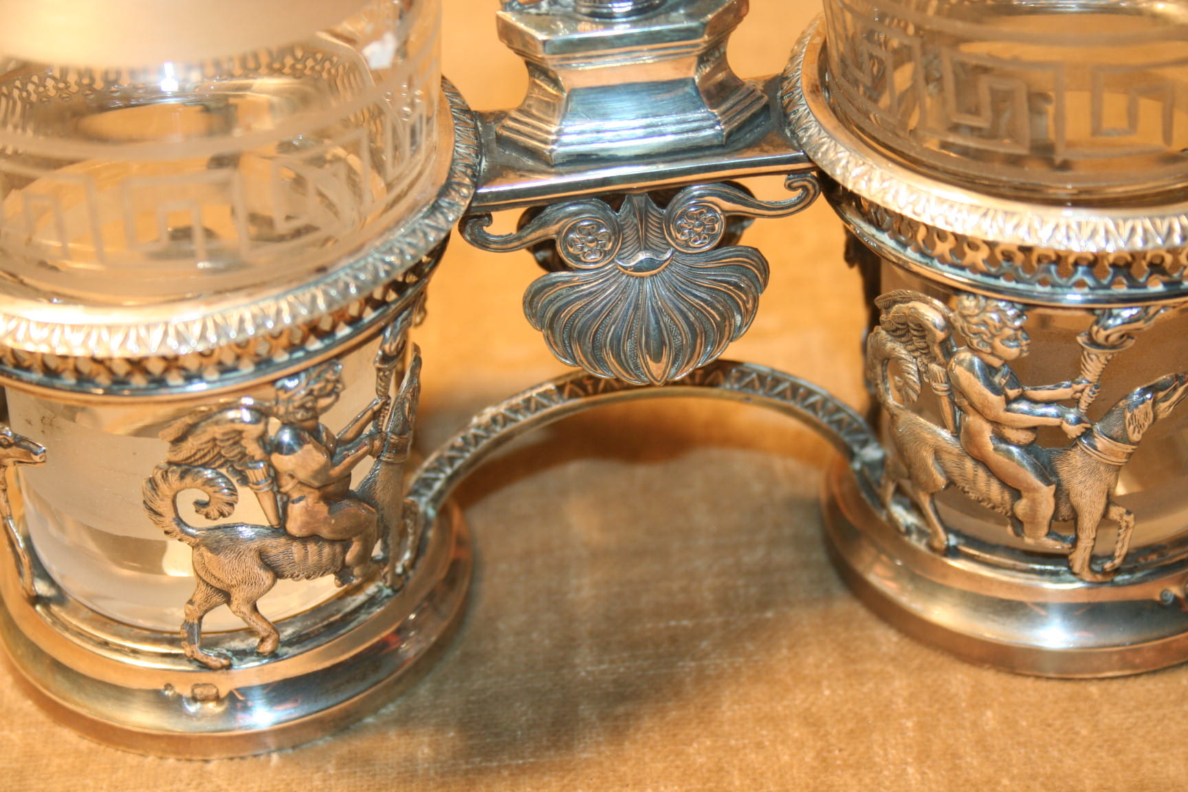 Francuski srebrny kabaret do oliwy i octu Empire XIX w. – putta na psach, srebro próby 800, karafki