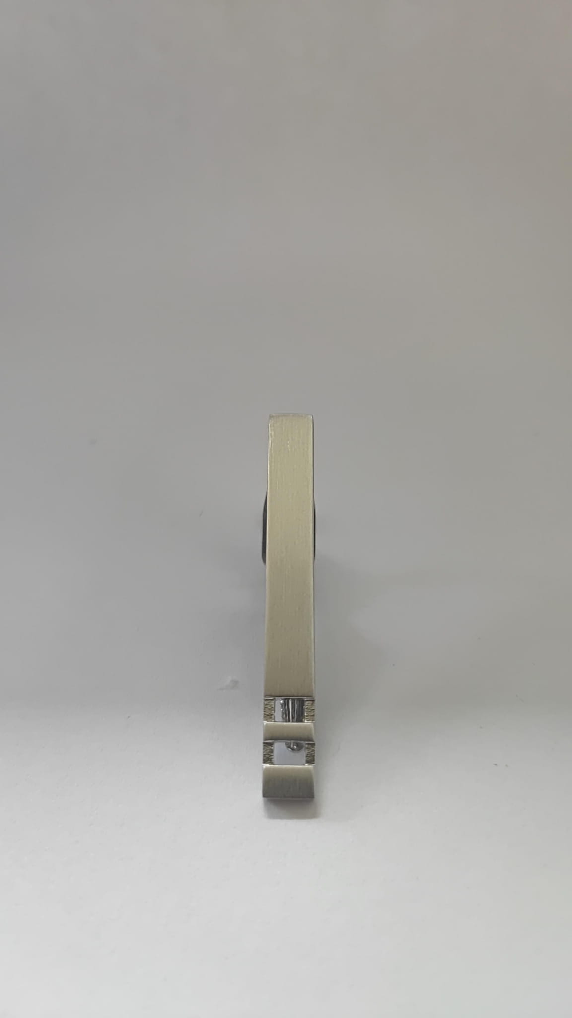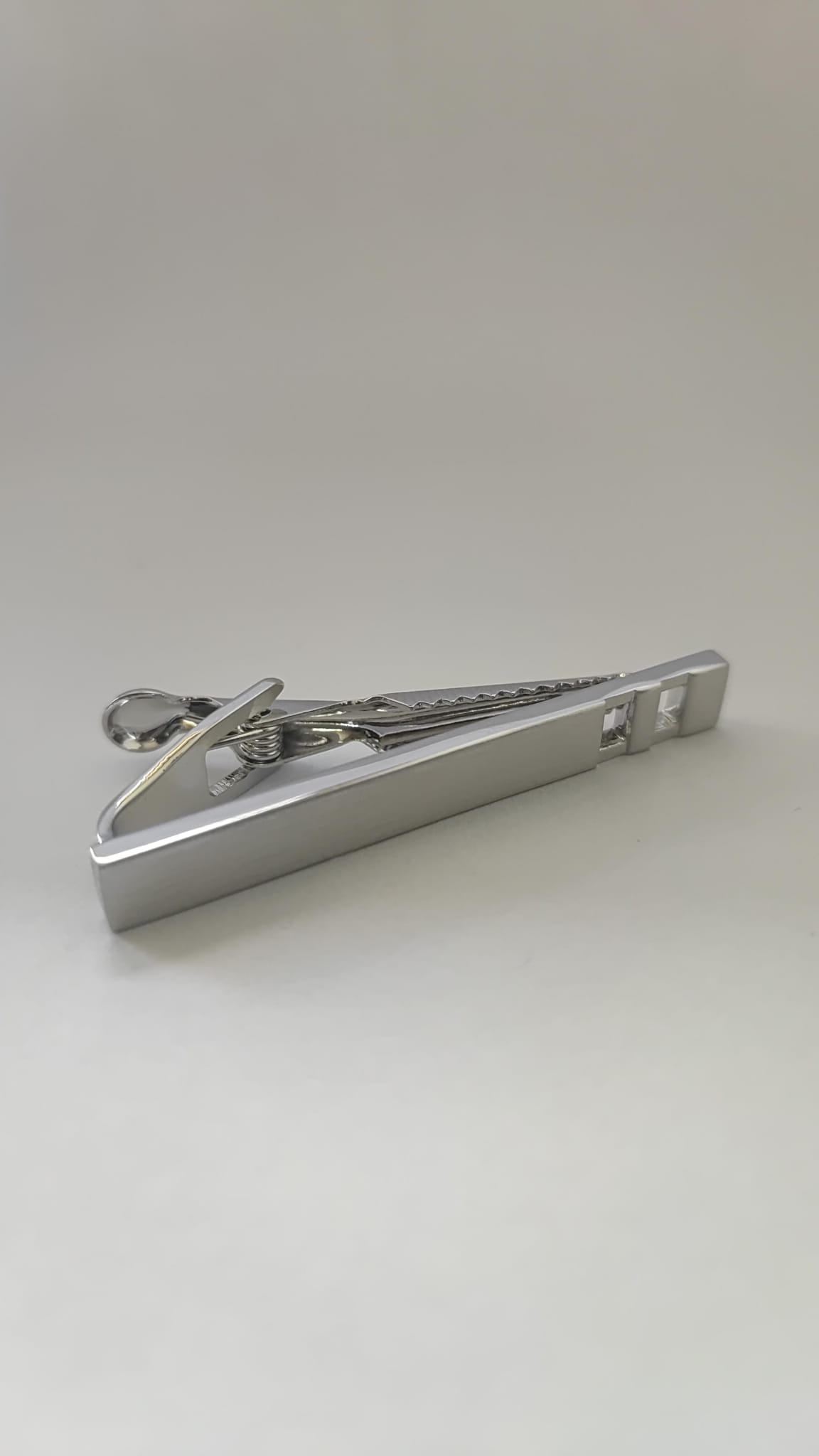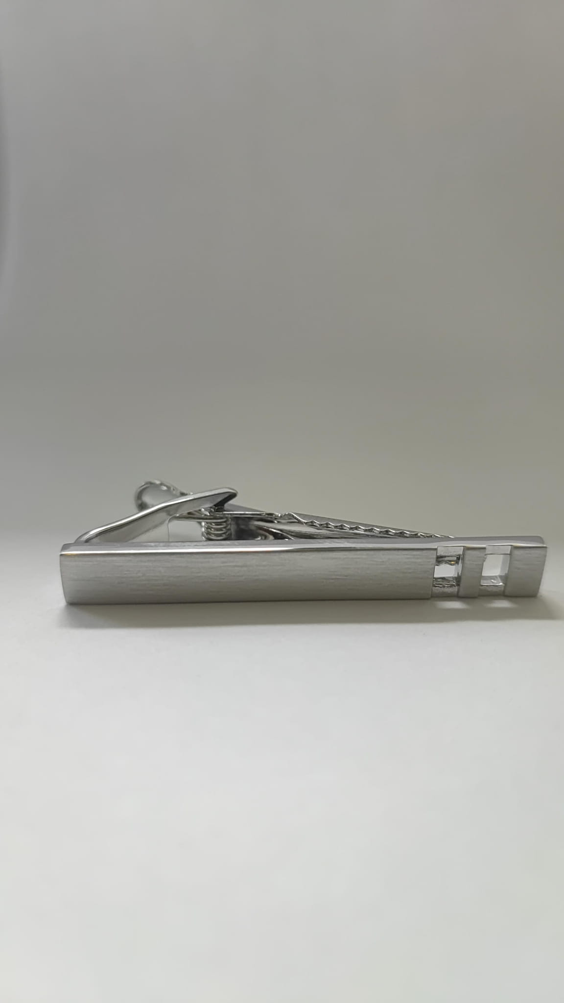 Spinka do krawata srebrna matowa z dwoma otworami Długość spinki 50 mm Szerokość spinki 5 mm Spinki oferowane są w gustownych czarnych opakowaniach