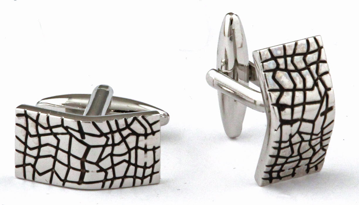 Spinki mankietowe klasyczne, mosiężne, galwanizowane rodem, z czarnym emaliowanym wzorem na powierzchni.