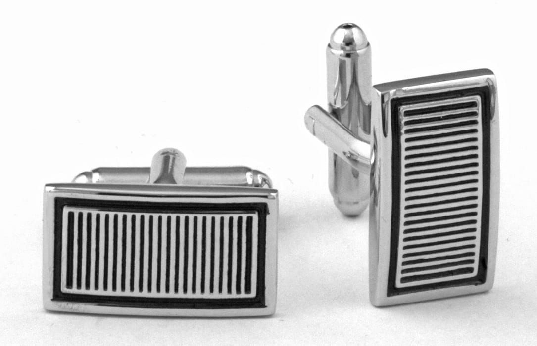 Spinki mankietowe klasyczne, mosiężne, galwanizowane rodem, z czarnym emaliowanym wzorem na powierzchni.